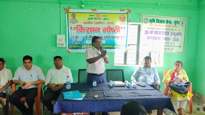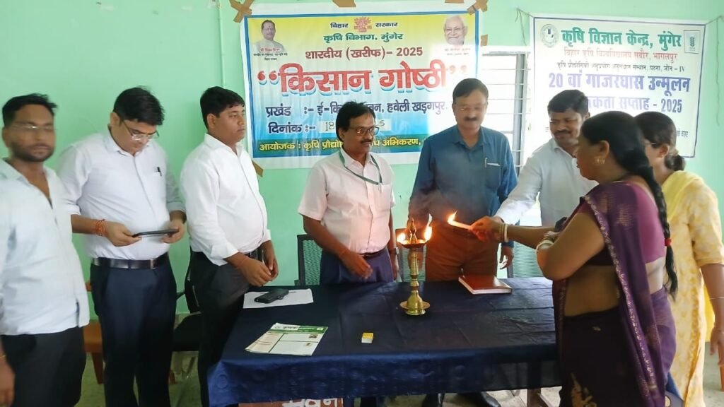 खड़गपुर प्रखंड के ई-किसान भवन सभागार में सोमवार को आत्मा मुंगेर के द्वारा किसान गोष्ठी का आयोजन किया गया। कार्यक्रम की अध्यक्षता अनुमंडल कृषि पदाधिकारी विपुल विपलव ने की। इस मौके पर उप परियोजना निदेशक पवन कुमार, कृषि विज्ञान केंद्र के वरीय वैज्ञानिक सह प्रधान मुकेश कुमार सिंह एवं अशोक कुमार उपस्थित थे। प्रखंड के कृषि समन्वयक, किसान सलाहकार,ATM BTM सहित करीब सैकड़ों किसान इसमें शामिल हुए।