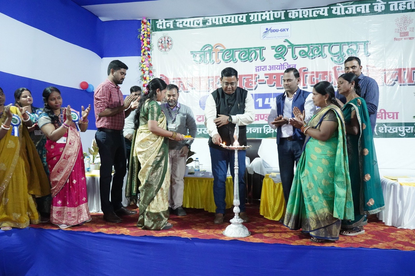 रोजगार मेला का उद्घाटन उपविकास आयुक्त श्री संजय कुमार, जिला परियोजना प्रबंधक, जीविका श्री संतोष कुमार सोनू, प्रखण्ड विकास पदाधिकारी, बरबीघा श्री अमित कुमार और विशाल एवं मार्गदर्शन जीविका संकुल संघ की दीदियों ने सम्मिलित रूप से दीप प्रज्ज्वलित कर कार्यक्रम का विधिवत उद्घाटन किया।