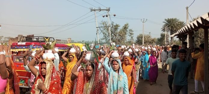 और मां शीतला स्थान, पहाड़िया स्थान के रास्ते चांद मिश्रा बासा होते हुए बेलखोरिया स्थित जमीन दरियापुर में नवनिर्मित श्री श्री 108 सर्वेश्वर नाथ महादेव के प्राण प्रतिष्ठा स्थल पहुंचे। इस कलश शोभायात्रा में कुल मिलाकर 651 कुंवारी कन्या व महिलाएं अपने सर पर कलश लेकर गाजे बाजे घोड़े रथ आदि के साथ नवनिर्मित मंदिर पहुंचे। ज्ञात हो कि महाशिवरात्रि के अवसर पर श्री श्री 108 सर्वेश्वर नाथ महादेव की प्राण प्रतिष्ठा के उपलक्ष पर कलश शोभायात्रा निकाली गई ।