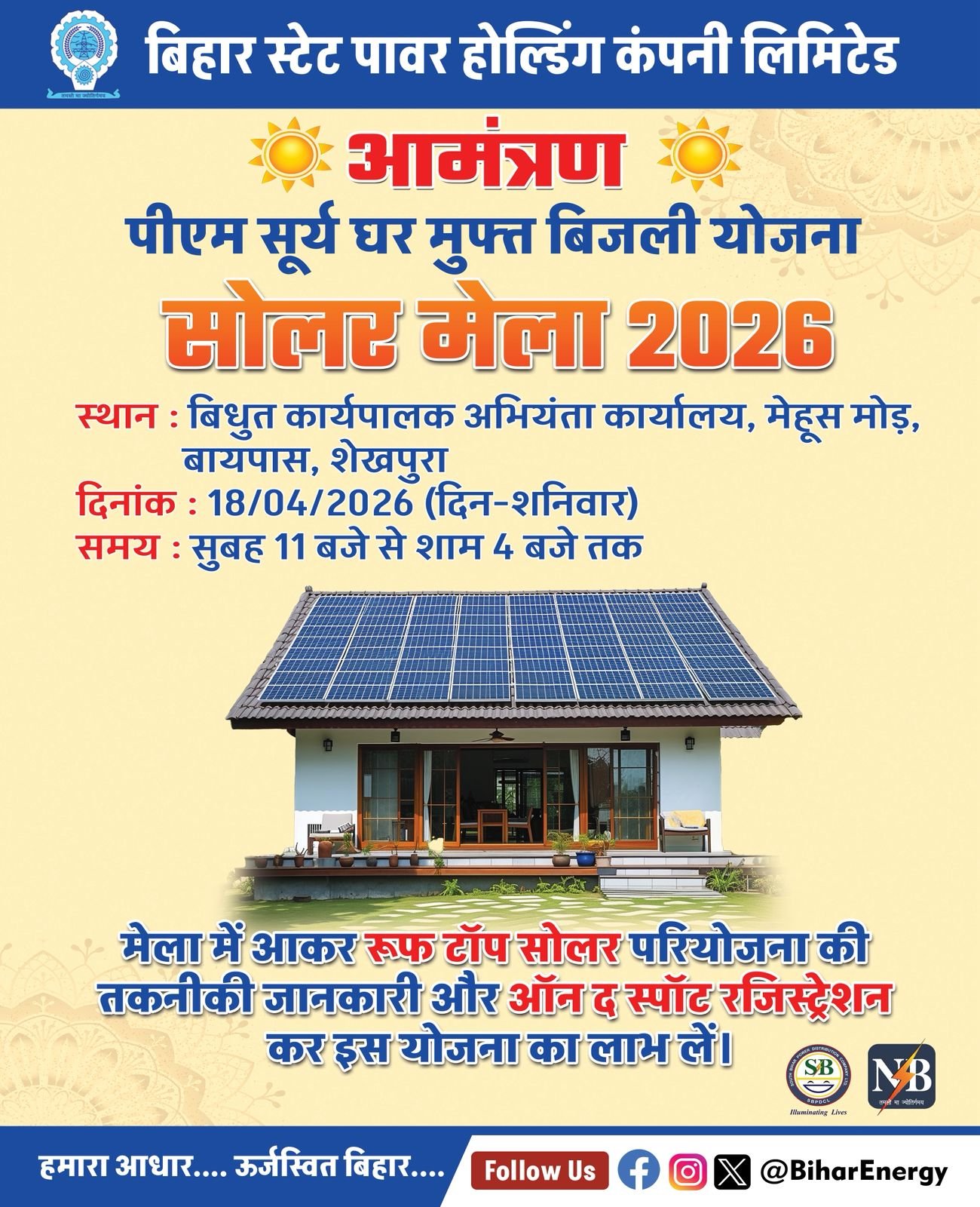 शेखपुरा: बिहार स्टेट पावर होल्डिंग कंपनी लिमिटेड द्वारा ‘पीएम सूर्य घर मुफ्त बिजली योजना’ के तहत शेखपुरा में *’सोलर मेला 2026’* का आयोजन किया जा रहा है। यह मेला आम नागरिकों को रूफटॉप सोलर योजना की तकनीकी जानकारी देने और मौके पर ही रजिस्ट्रेशन की सुविधा के लिए लगाया जा रहा है।
