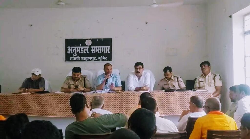 हवेली खड़गपुर अनुमंडल कार्यालय स्थित सभागार में शनिवार को दुर्गा पूजा को शांतिपूर्ण ढंग से संपन्न कराने को लेकर शांति समिति की बैठक आयोजित की गई। बैठक की अध्यक्षता एसडीएम राजीव रोशन ने की, जबकि एसडीपीओ अनिल कुमार, प्रशासनिक पदाधिकारी, जनप्रतिनिधि और पूजा समिति के सदस्य मौजूद रहे।