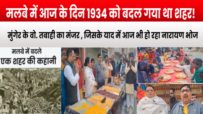 कार्यक्रम के तहत नारायण भोज का आयोजन किया गया, जिसमें पूड़ी, सब्जी, बूंदिया, खीर, रसगुल्ला और चटनी सहित विभिन्न प्रकार के व्यंजन परोसे गए। भूकंप दिवस समिति के सदस्यों ने बताया कि इस वर्ष भी एक हजार से अधिक लोगों को शुद्ध एवं स्वादिष्ट भोजन कराया गया। समिति के सदस्यों ने 1934 के भयावह भूकंप की स्मृतियों को साझा करते हुए बताया कि उस त्रासदी में पूरा मुंगेर शहर मलबे में तब्दील हो गया था और हजारों लोगों की जान चली गई थी।